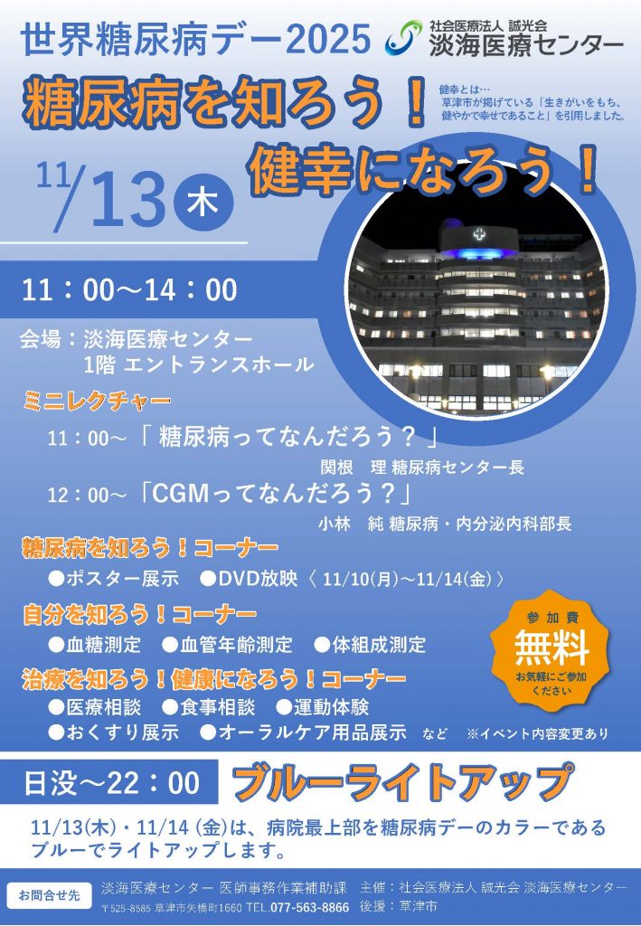 糖尿病を知ろう!健幸になろう! 世界糖尿病デーに合わせて糖尿病についてのミニレクチャーや血糖測定、体組成測定、運動体験などのイベントを行います。また、11/13(木)、14(金)は病院最上部を糖尿病デーのカラーであるブルーでライトアップします。 ぜひ、お気軽にお越しください。