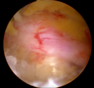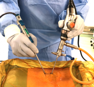 内視鏡画像バイポータル脊椎内視鏡手術は名前の如く、2カ所の小さな切開部(約5~6㎜)から内視鏡と手術器具をそれぞれ挿入して行う手術です。