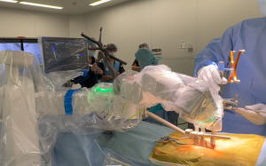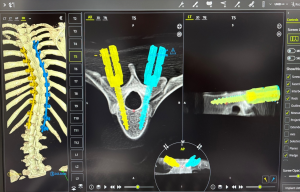 そこで当院では、メドトロニック社の「MAZOR X Stealth Edition」を導入しました。術前のCT画像と術中に撮影した2枚のX線画像から患者さんの体の位置や背骨の配列をAI機能でマッチングさせ、術前に計画した通りに自動でスクリューを挿入します。これにより術者の技術に依存せず、正確かつ確実にスクリューを挿入することが可能になりました。また、手術中に使用するX線照射量が格段に減少したことで、患者さん・術者双方の被爆量も減少し、低侵襲性の向上を実現しました。